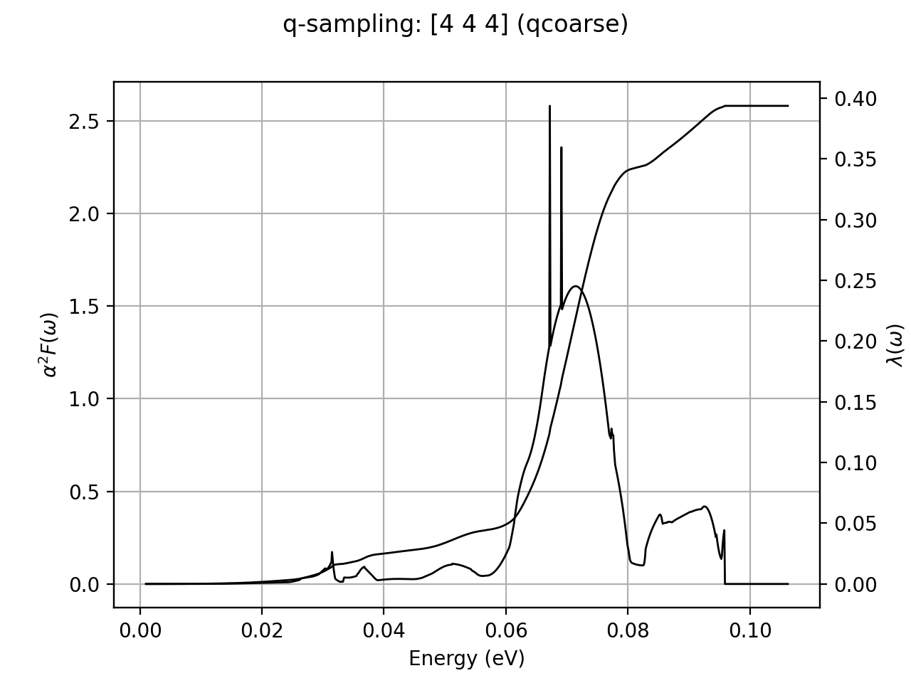 Due to the \(1/\omega\) factor, “low-energy” modes are expected to contribute more to \(\lambda\) than “high-energy modes”. On the other hand, \(\alpha^2F(\ww)\) should go to zero as \(\ww^2\) for \(\ww \rightarrow 0\) so that the integrand function is finite at the acoustic limit. Obviously, if the system is not dynamically stable (“negative” frequencies in the BZ) \(\lambda\) will explode but this does not mean you have found a room-temperature superconductor!