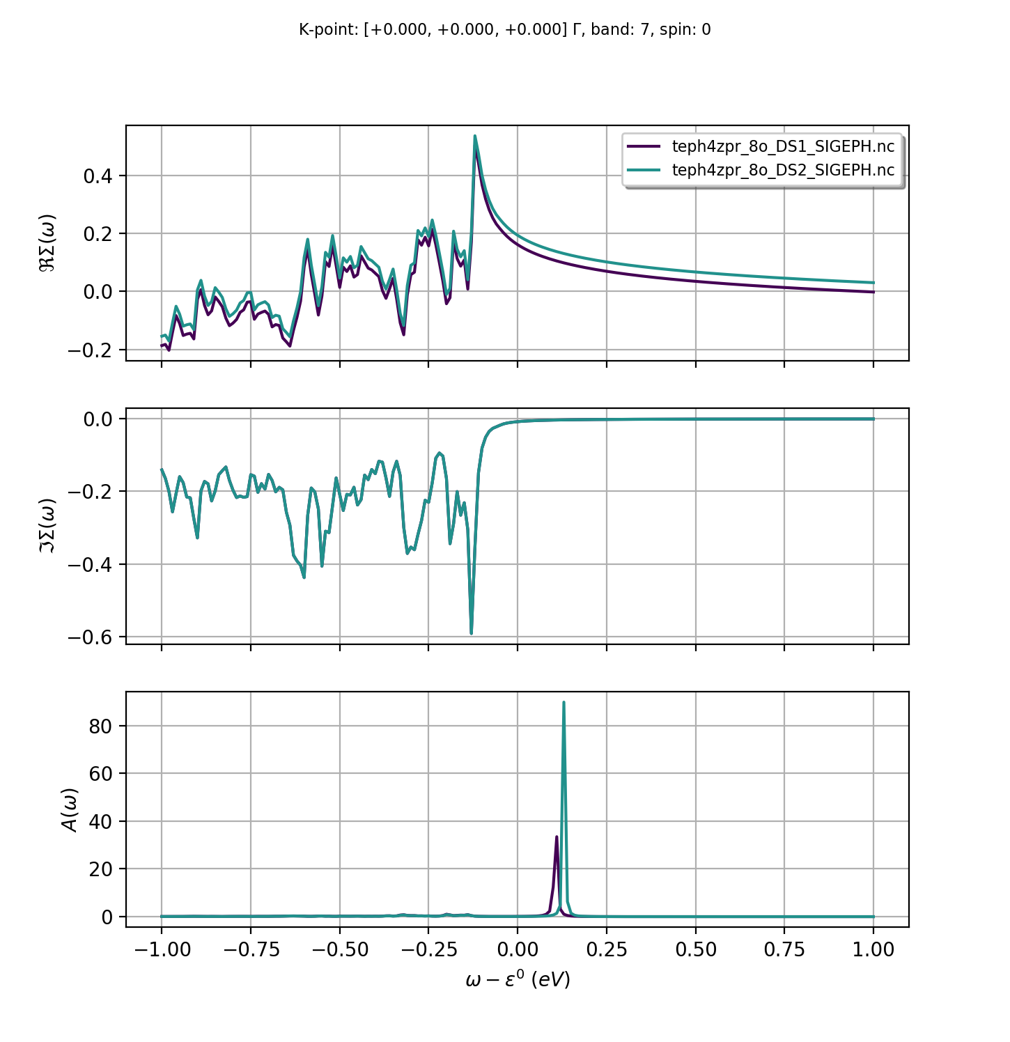 to plot \(\Sigma_\nk(\ww)\) and \(A_\nk(\ww)\) at the \(\Gamma\) point for band index 7 (conduction band maximum). Note that in python indices start from 0 whereas ABINIT uses Fortran conventions with indices starting from 1. In a nutshell, one should substract 1 from the Fortran band index when calling AbiPy functions.