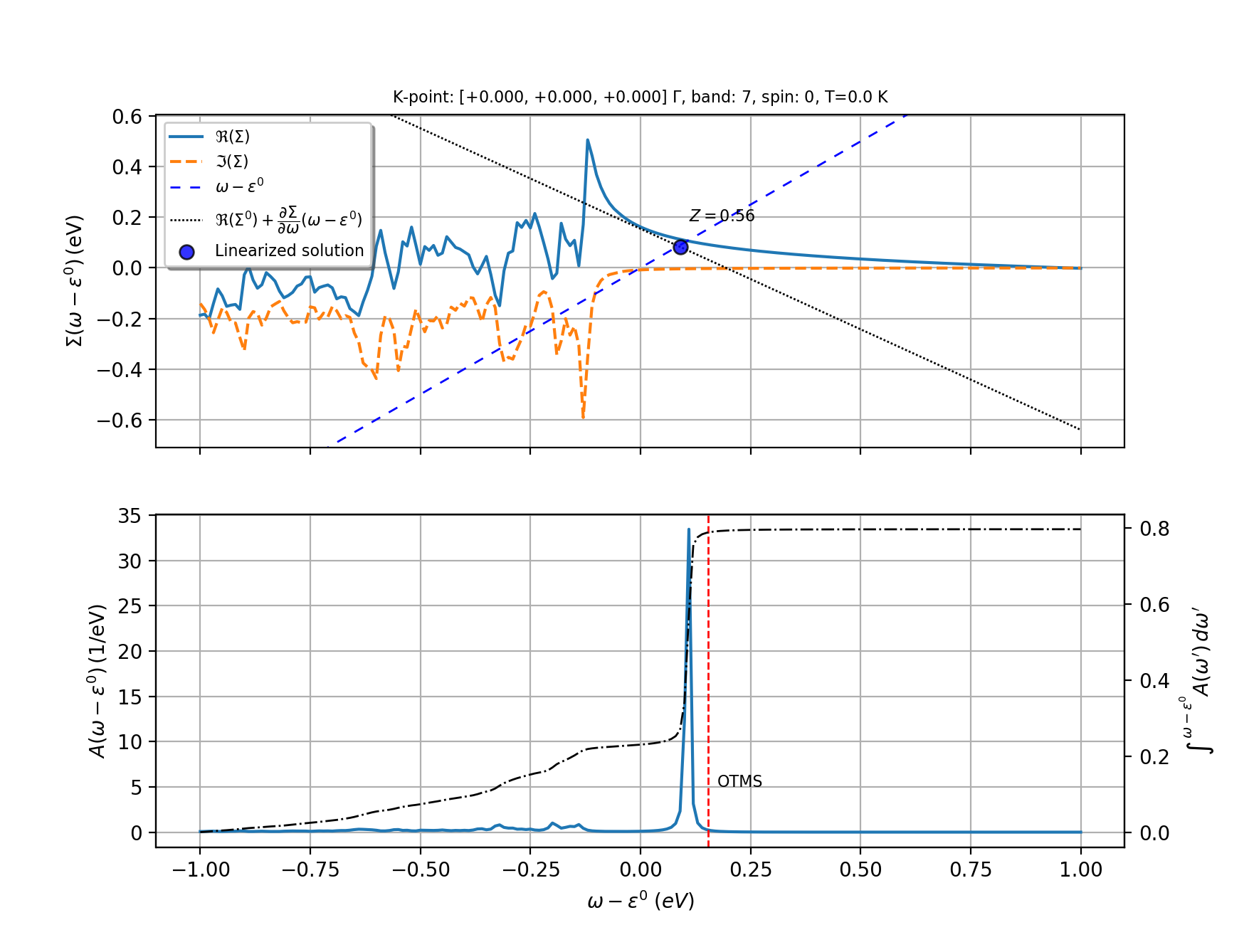 (iiii) The vertical red line in the second figure gives the on-shell QP energy. As already mentioned previously, the OTMS energy derives from a static formalism that reduces to the linearized QP result only if \(Z = 1\) so it is not surprising to see that the QP peak differs from the OTMS energy. Still, this does not mean that the OTMS is wrong. Actually, it is more puzzling the fact that the background in \(A_\nk(\ww)\)is strongly suppressed and no phonon satellite is clearly visible. Obviously, our entire discussion is based on completely underconverged results but the more careful investigation reported in [Nery2018] indicates that an accurate description of dynamical effects requires the (approximate) inclusion of additional Feynmann diagrams through the cumulant expansion and that the OTMS approximation gives QP energies that are much closer to the QP peak obtained with the cumulant method.