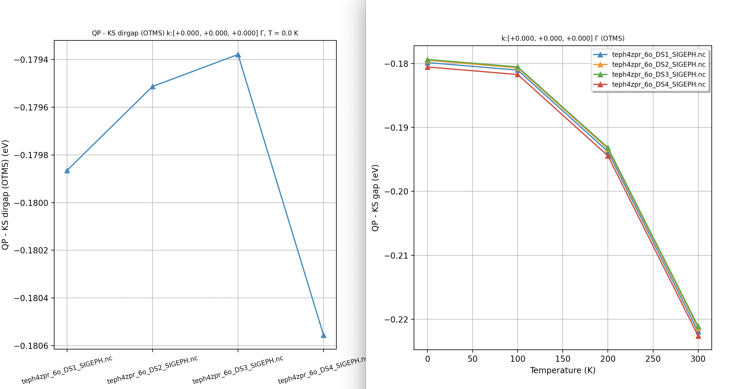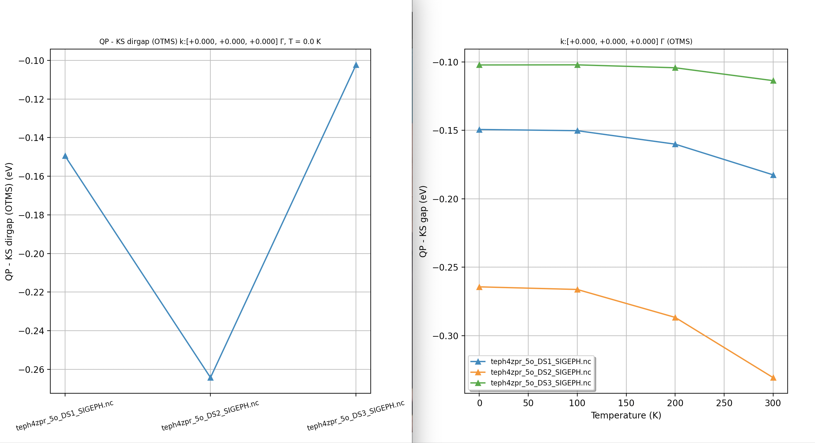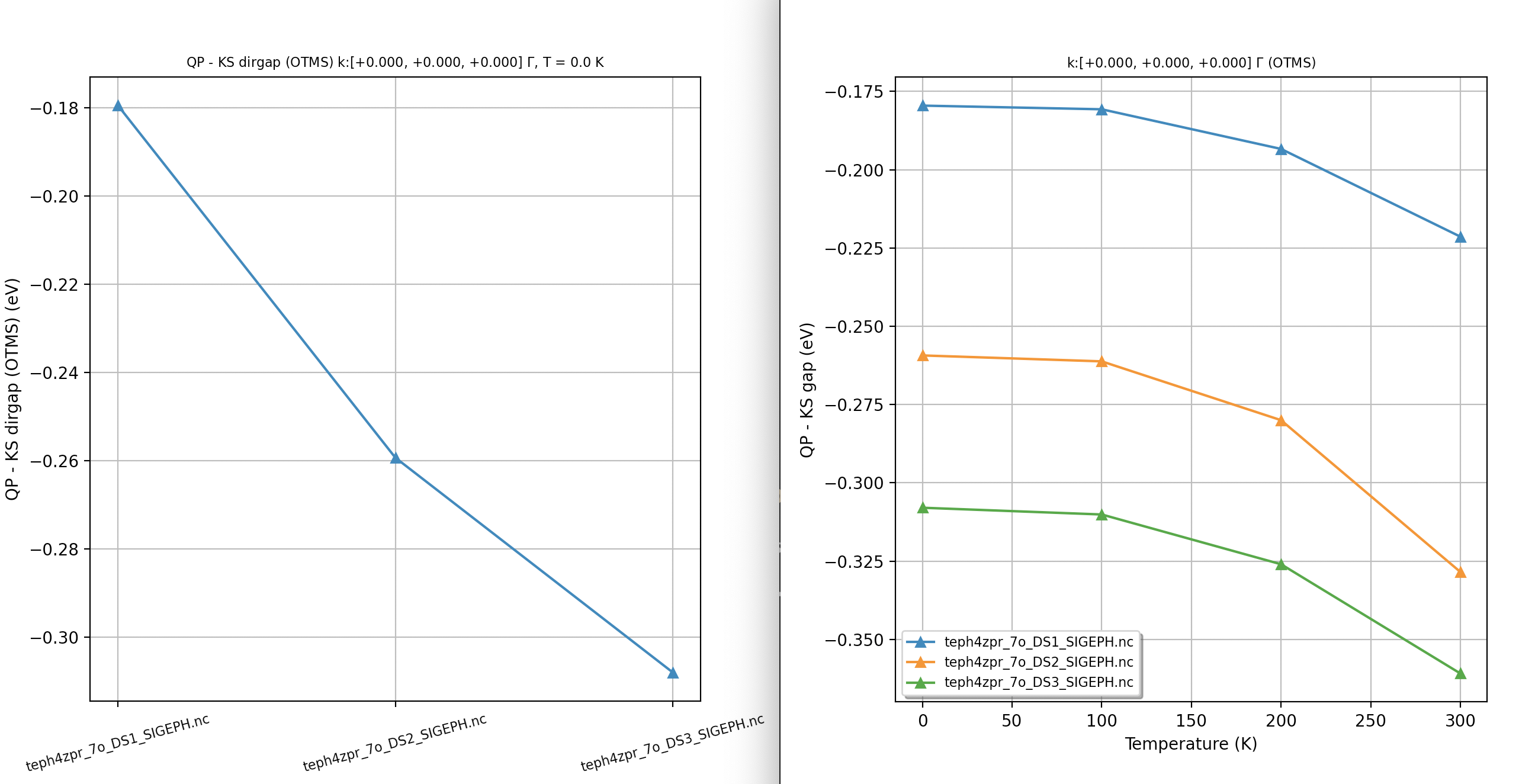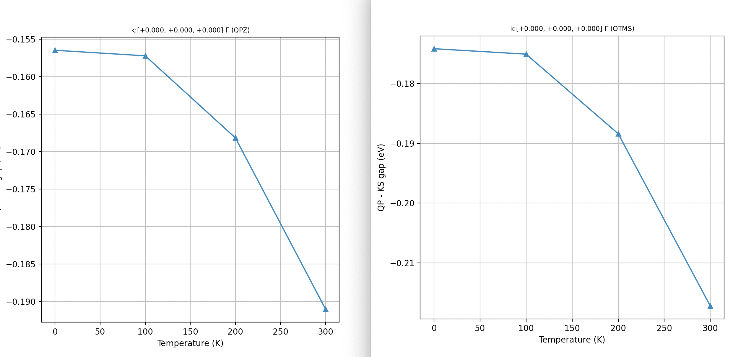 In semiconductors and insulators, indeed, most of the temperature dependence of the electronic properties at “low” \(T\) originates from the e-ph interaction and the thermal expansion of the unit cell (topic that, however, won’t be discussed in this lesson). Corrections due to \(\Sigma^{\text{e-e}}\) are obviously important as it is well known that KS gaps computed with LDA/GGA are systematically underestimated compared to experimental data. Nevertheless, the temperature dependence of \(\Sigma^{\text{e-e}}\) is rather small as long as \(kT\) is smaller than the fundamental gap (let’s say \(3 kT < E_{\text{g}}\)).