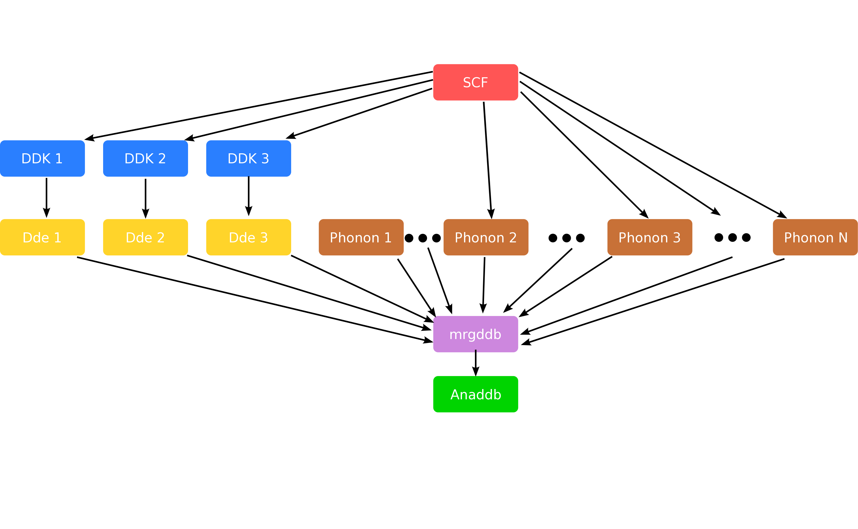 In short, the idea is that, in order to compute properties for which the phonon frequencies are needed in the full Brillouin zone, one can use an elaborate Fourier interpolation, so that only few dynamical matrices need to be computed directly. Others will be computed by interpolation. A schematic representation of the different steps required to compute the dynamical matrix in the IBZ and post-process the results with anaddb is given below.